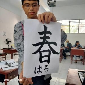 Sambil menunggu Kakak Via mengikuti lombat desain grafis saya mengikuti Pelajaran menulis huruf kanji. Sebenarnya bukan menulis, lebih tepatnya menggambar karena sapuan kuasnya tidak sembarangan, satu garis ada tekanan halus dan tebal seperti kaligrafi. Terima kasih panitia yg sudah kasih pelajaran menulis kanji.