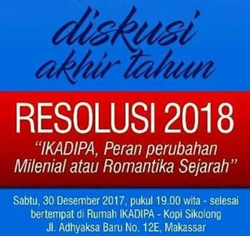 Pada hari sabtu tgl 30 desember 2017 pengurus Ikatan Alumni STMIK Dipanegara mengadakan Diskusi Akhir Tahun dengan tema “Resolusi 2018 IKADIPA Peran Perubahan Milenial atau Romantika Sejarah”. Diskusi ini di gelar di Rumah IKADIPA, Jl Adhiyaksa Baru.